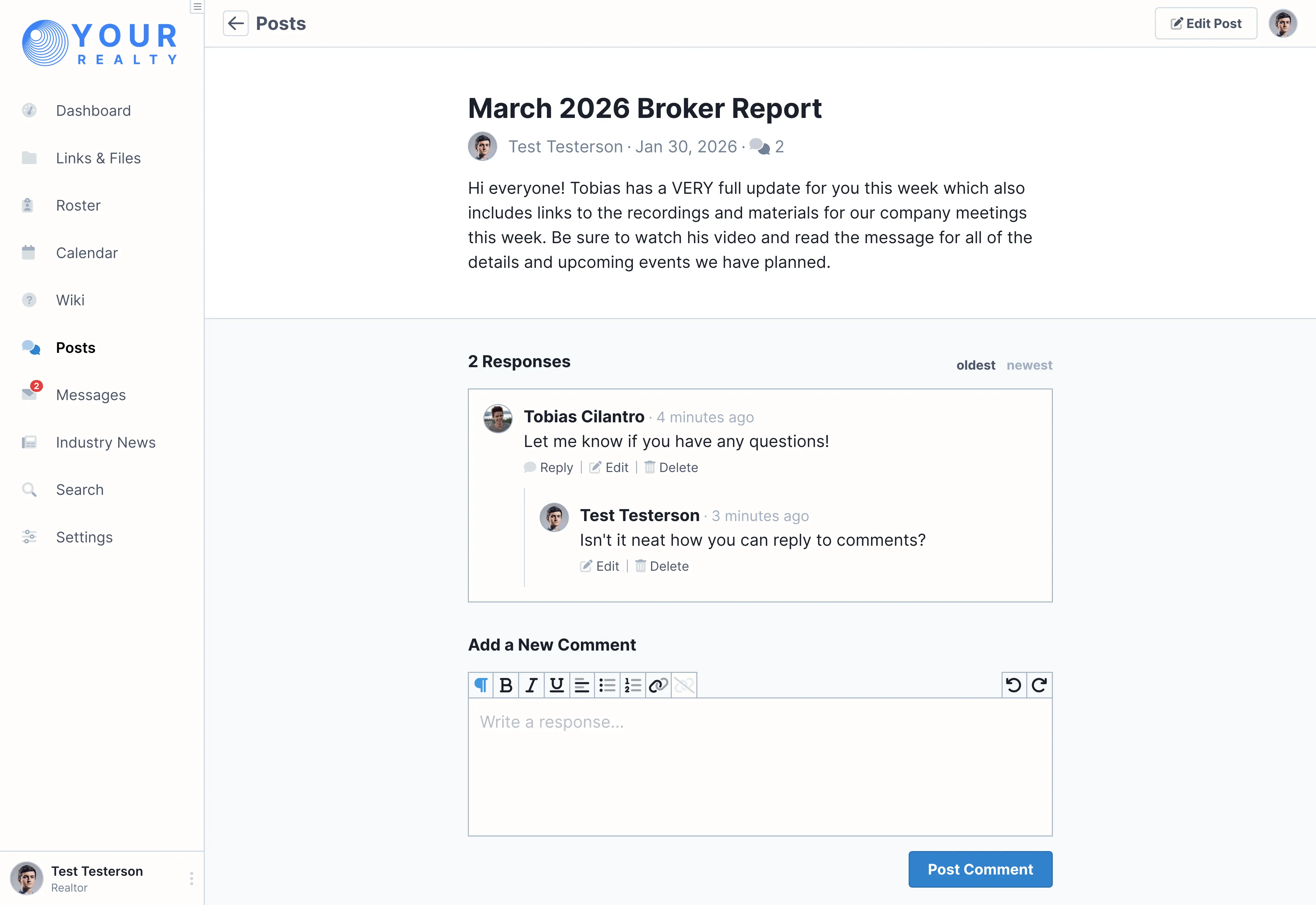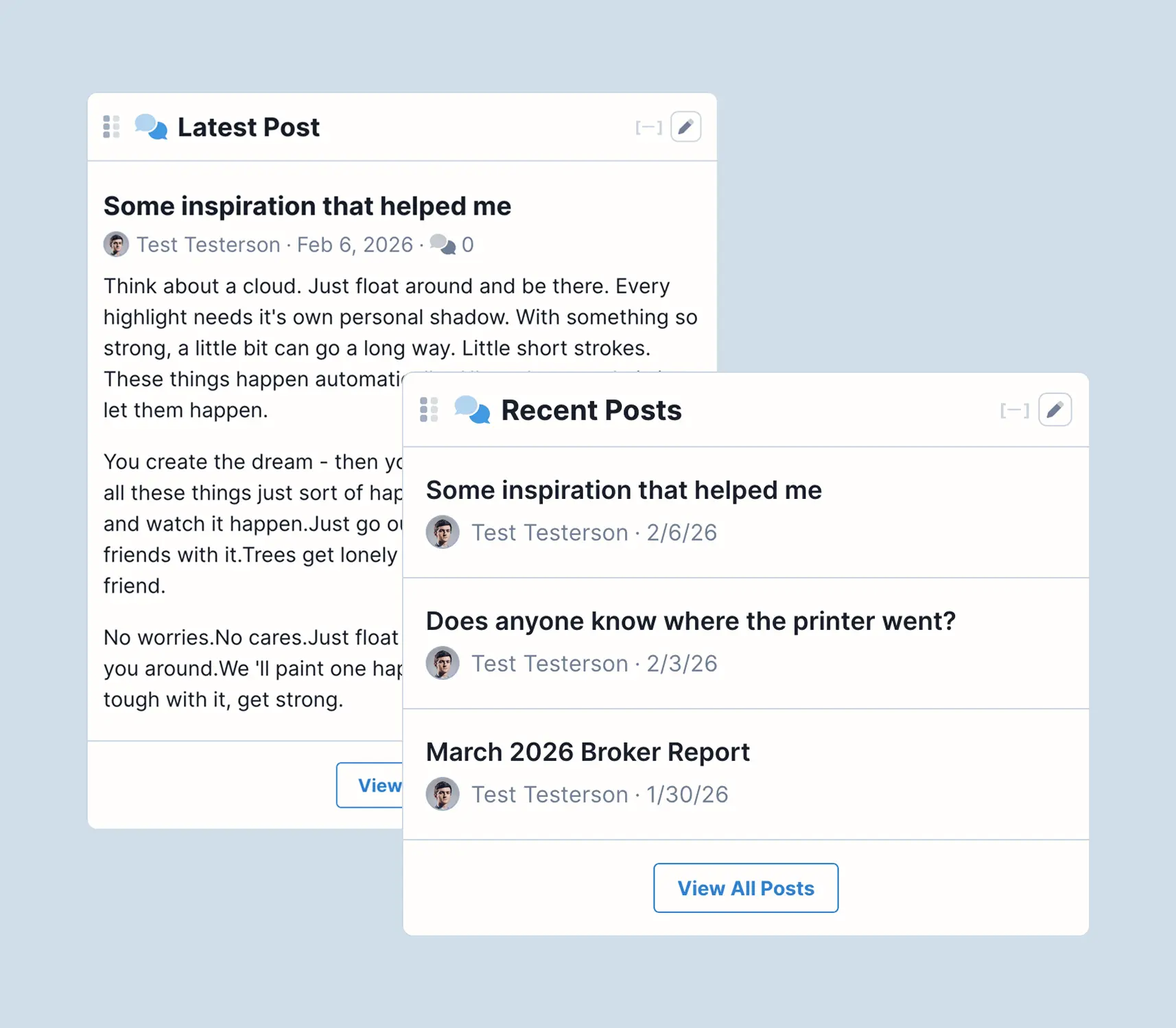 Give agents a dependable place to share news, ask questions, and keep conversations moving. Posts help replace long email threads with a centralized feed the whole team can reference. It is where announcements live, discussions happen, and important updates stay visible to the right people.